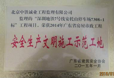 近日,中鐵誠(chéng)業(yè)監(jiān)理公司深圳地鐵7號(hào)線項(xiàng)目部榮獲“2014年下半年廣東省建筑安全協(xié)會(huì)雙A級(jí)安全文明標(biāo)準(zhǔn)化工地和安全生產(chǎn)文明施工示范基地”榮譽(yù)稱號(hào),受到廣東省建筑安全協(xié)會(huì)通報(bào)表彰。中鐵誠(chéng)業(yè)監(jiān)理公司在深圳地鐵7號(hào)線7208標(biāo)中被深圳地鐵公司授予“優(yōu)勝單位”稱號(hào),在7208監(jiān)理部?jī)?nèi)張占彪榮獲“優(yōu)秀總監(jiān)理工程師”稱號(hào),樊立魏、孟繁玉、李福建榮獲2014年深圳地鐵7號(hào)線“優(yōu)秀監(jiān)理工程師”稱號(hào)。
