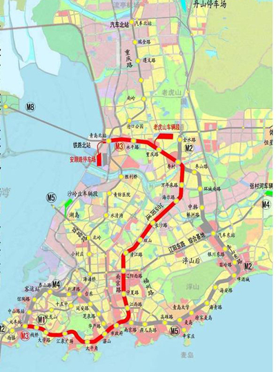 青島市地鐵一期工程(3號線)線路西起自市南區(qū)的青島火車站,向東沿廣西路、太平路、文登路、香港路,至五四廣場(市政府)拐入南京路向北,經(jīng)江西路、寧夏路、遼陽西路,后進入哈爾濱路、黑龍江路、萬年泉路至李村,向西沿京口路、振華路至終點鐵路青島北站。青島市地鐵一期工程(3號線)總體呈“西-東-北-西”走向,途經(jīng)市南區(qū)、市北區(qū)、四方區(qū)、李滄區(qū),全長約24.779km,全部為地下線,設(shè)車站22座,其中換乘車站6座,分別與規(guī)劃1號、2號、4號、5號、8號線換乘。本線在北端的火車北站附近設(shè)安順車輛段和綜合基地一座。在河西站附近設(shè)控制中心一座。我公司承擔(dān)了全線的通信系統(tǒng)、綜合監(jiān)控系統(tǒng)、車輛段的設(shè)計咨詢工作。目前,該工程已進行到各系統(tǒng)用戶需求書的咨詢階段。