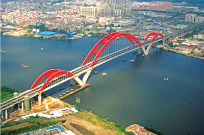 廣州新光大橋是世界上第一座由鋼桁拱與V型剛構(gòu)組合而成的飛雁式三跨中承式拱橋,主橋為177+428+177m的三跨連續(xù)剛構(gòu)鋼桁拱橋。主、邊拱拱肋采用五大段提升法施工,其中邊拱為原位拼裝、垂直提升,主拱為碼頭拼裝、滑移上船、浮運(yùn)就位、垂直提升,創(chuàng)造了我國橋梁施工整體提升重量及高度的最高紀(jì)錄(2600t,約96m),在世界橋梁施工中名列前茅。
