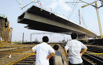北京市五環(huán)路石景山南站特大橋主橋跨越石景山南站編組站咽喉區(qū),鐵路線間距小、行車密度大,為了既能快速、安全地在電氣化鐵路站場上加起高架橋,又可不干擾或盡量少干擾正常的鐵路運(yùn)輸。該橋主橋采用了轉(zhuǎn)體法施工的45+65+95+40m四跨連續(xù)獨(dú)塔單索面預(yù)應(yīng)力混凝土曲線先拉齊奧,轉(zhuǎn)體重量達(dá)14000噸。該橋或2005年度國家優(yōu)質(zhì)工程銀質(zhì)獎,2006年度建設(shè)部優(yōu)秀設(shè)計(jì)一等獎,全國優(yōu)秀工程設(shè)計(jì)金質(zhì)獎。