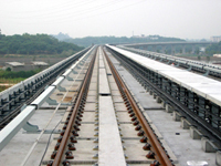 在設(shè)計工作中,中鐵咨詢集團(tuán)設(shè)計人員根據(jù)直線電機牽引系統(tǒng)的特點,在國內(nèi)城鐵高架線上首次采用了預(yù)制道床板、砂漿填充墊層的高架橋板式軌道技術(shù)。本結(jié)構(gòu)方案特點是,結(jié)構(gòu)整體強、穩(wěn)定性好,軌道施工質(zhì)量高,便于感應(yīng)板、三軌和鋼軌的精確定位;與其它工法相比,在高架線路上施工作業(yè)空間大,方便各工序的交叉作業(yè)流程,施工效率比較高。